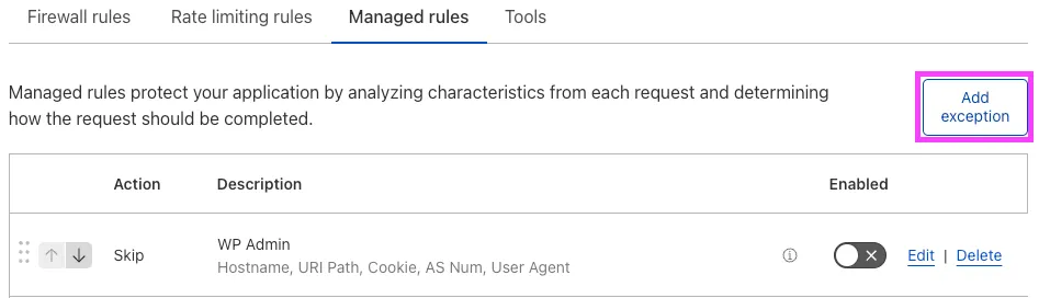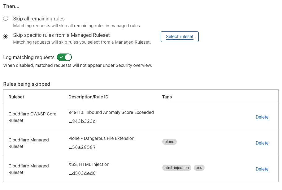 注意: CMSの特定のルールがサイトの非CMSセクションで問題を引き起こす場合は、それらをスキップするルールを追加することも検討してください。上記の手順に従い、上記で有効にしたCloudflare管理ルールセットのルールをスキップするように設定できます。ホスト名、URI、またはクッキーに基づいて、等しくない、マッチしない、または含まない演算子を使用して設定できます。